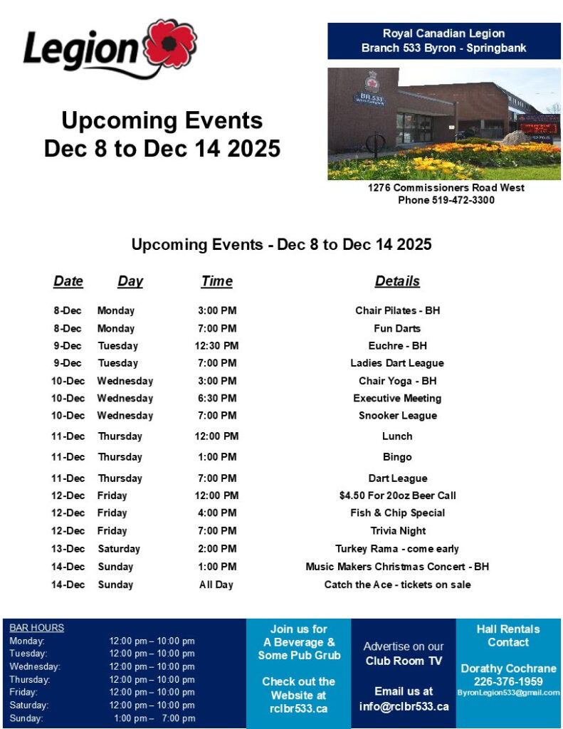Yesterday we kicked off sales for Catch the Ace. You can now purchase your tickets at the bar or online at byronlegioncatchtheace.ca. The first draw will be held January 4 at 4 pm. and weekly thereafter until the Ace of Spades is found.