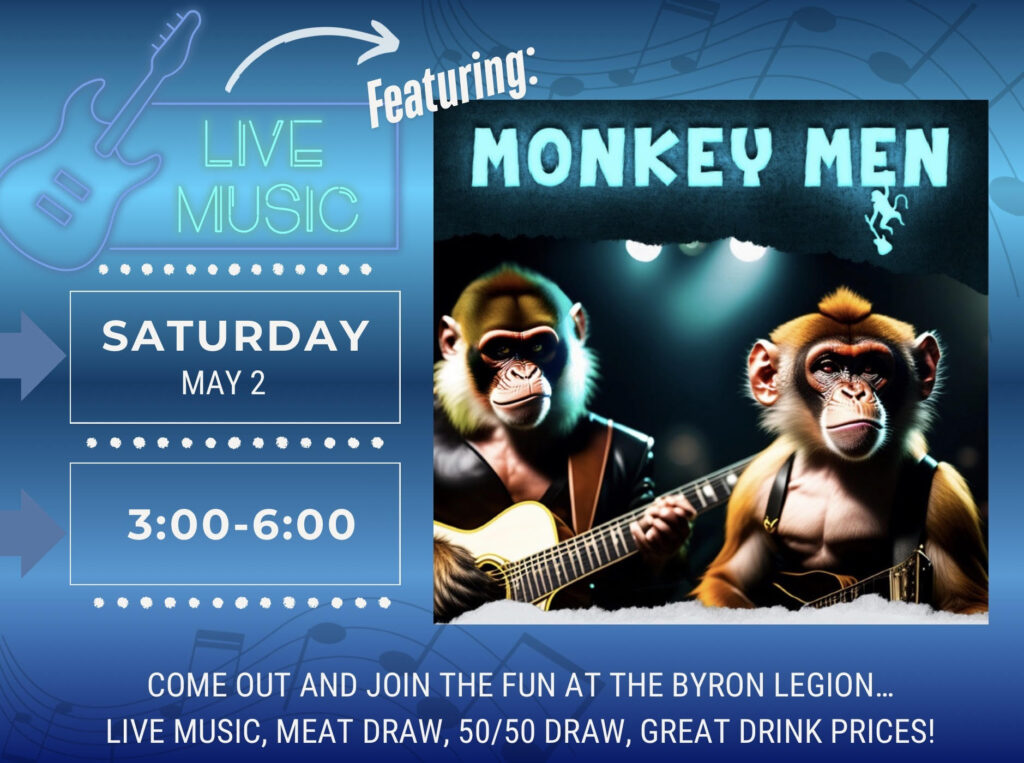 On Saturday, May 2, the action starts in the afternoon with Meat Draws and live entertainment from Monkey Men from 3–6 PM, followed by Euchre at 7 PM.