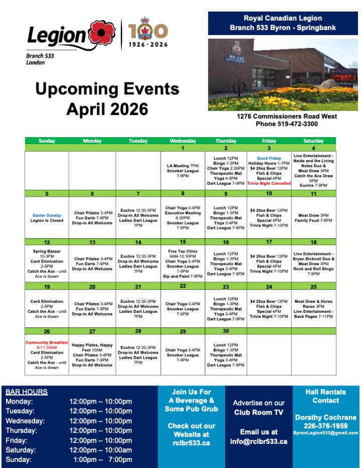 Calendar, Dancing, Eating, Eats, Special Events, Upcoming Events Calendar and Weekly events By RCLBR533 Admin Our online Monthly Calendar is kept up to date. – Click here to check it out Click to enlarge Events this week – 20-26 Apr 2026 Buy your CATCH THE ACE Tickets
